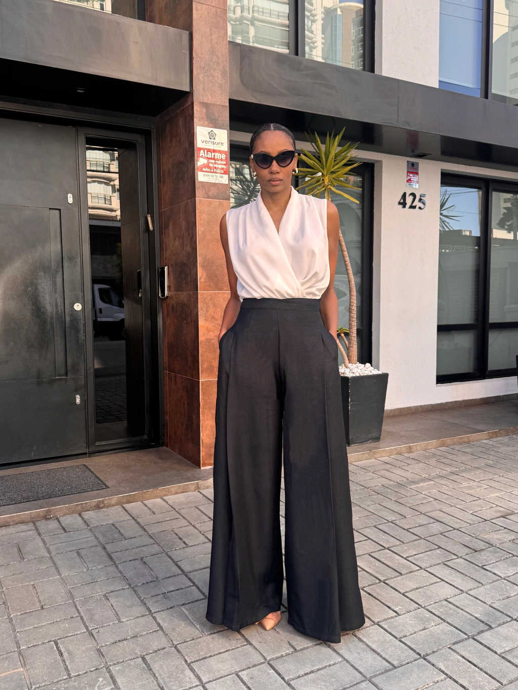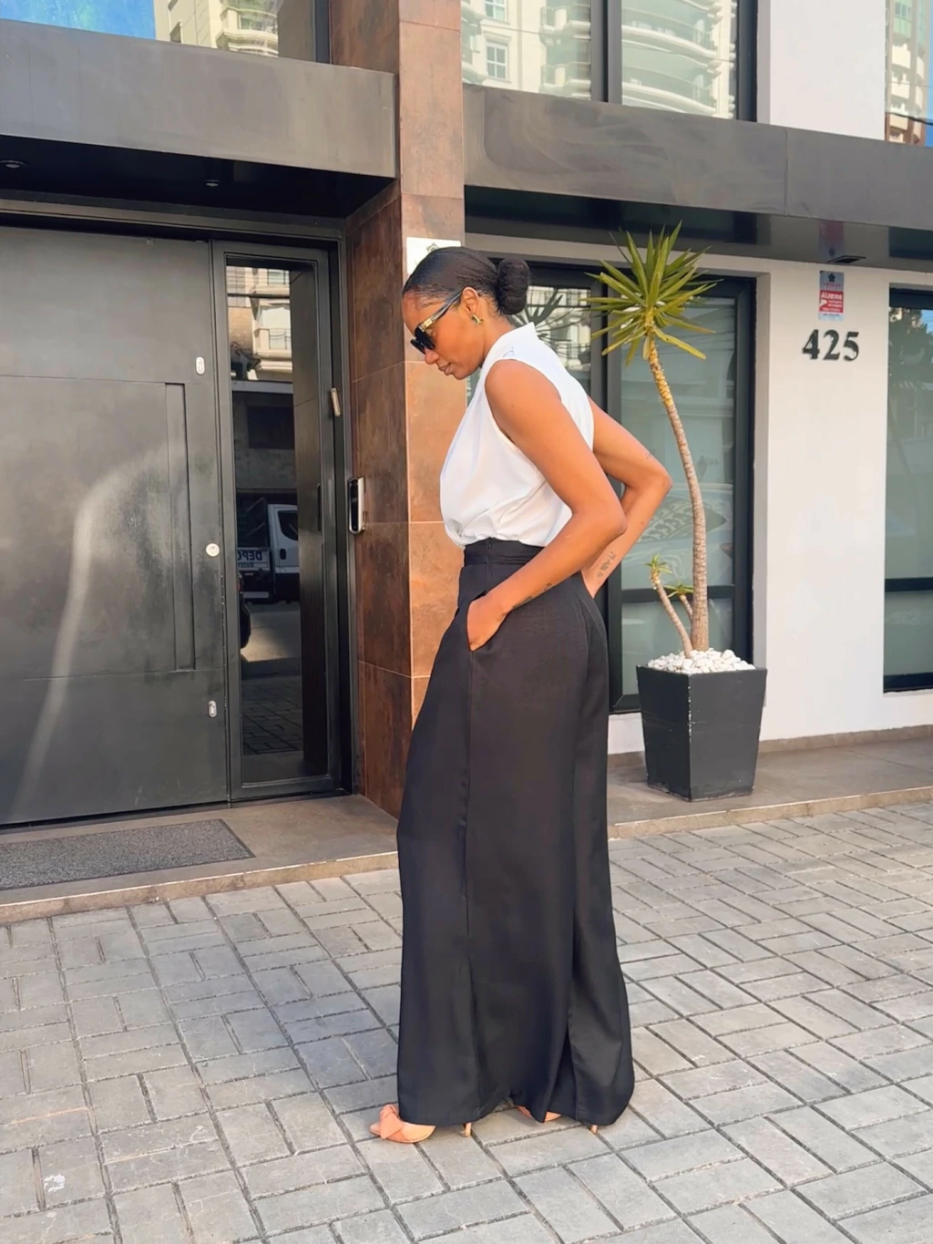 O preto intenso reforça sua versatilidade e atemporalidade, enquanto a cintura alta alonga a silhueta e traz conforto na medida certa.