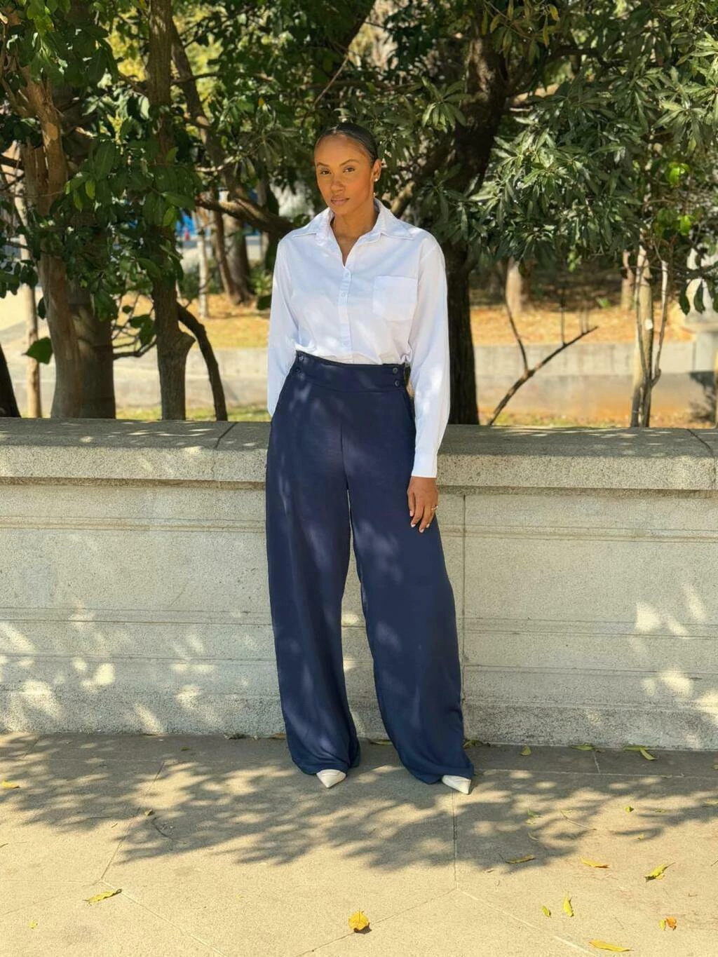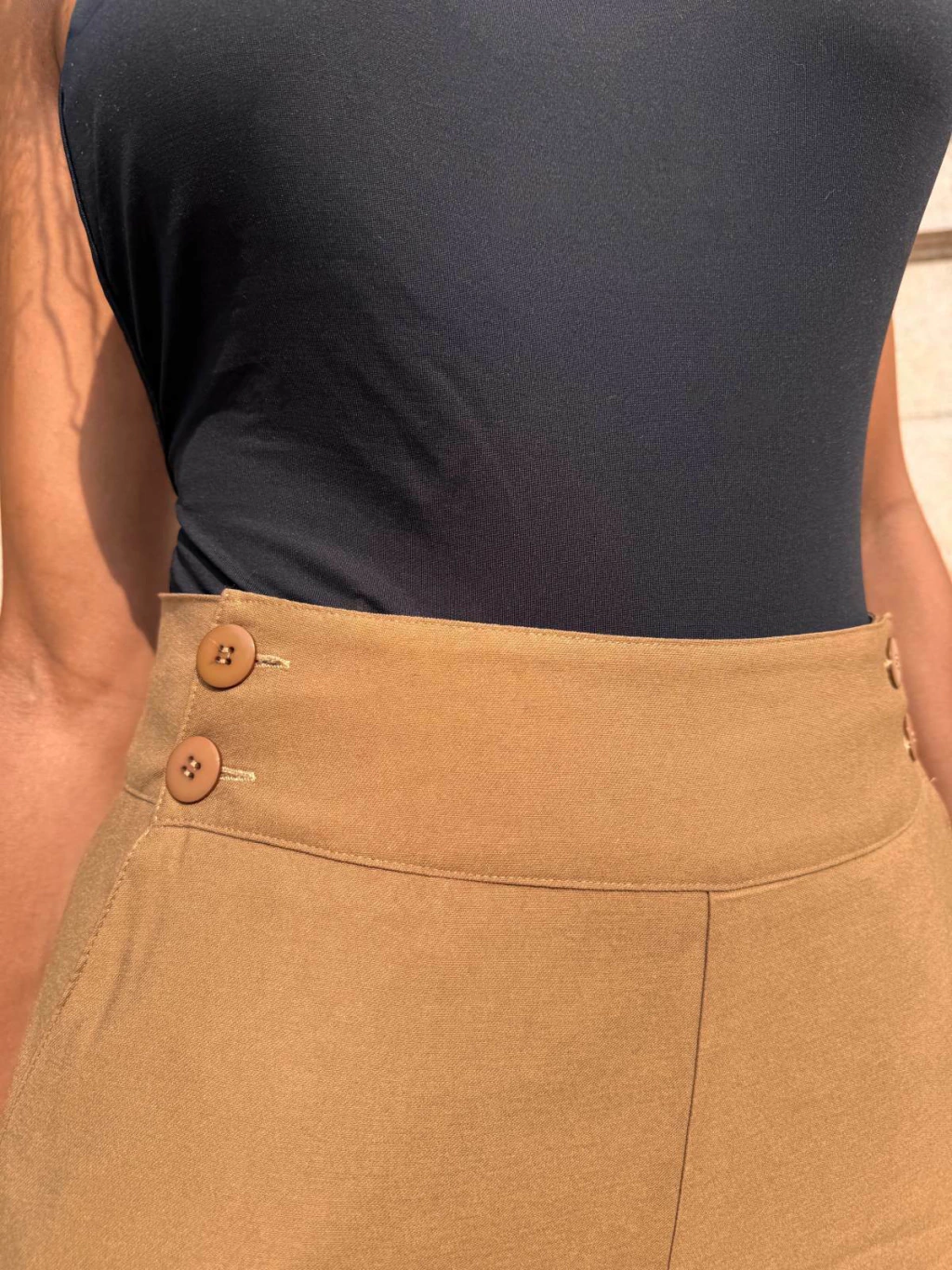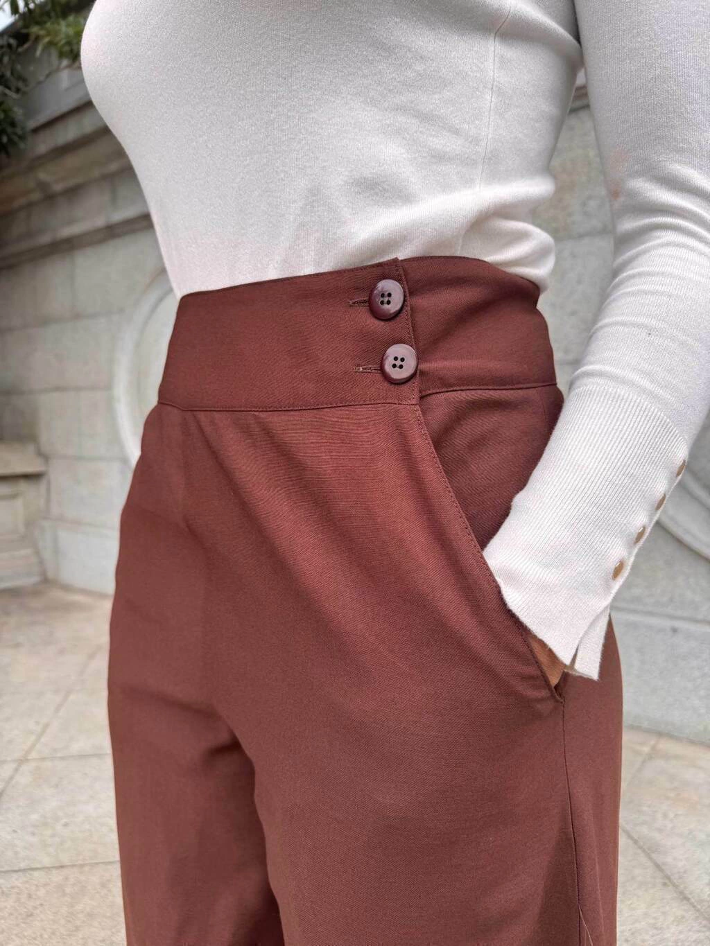 Design Sob Medida: Pensada para garantir um caimento perfeito em mulheres altas, a calça possui cintura alta, fechamento com 4 botões frontais e bolsos laterais funcionais. Além disso, você pode ajustar a cintura facilmente movendo os botões de lugar.