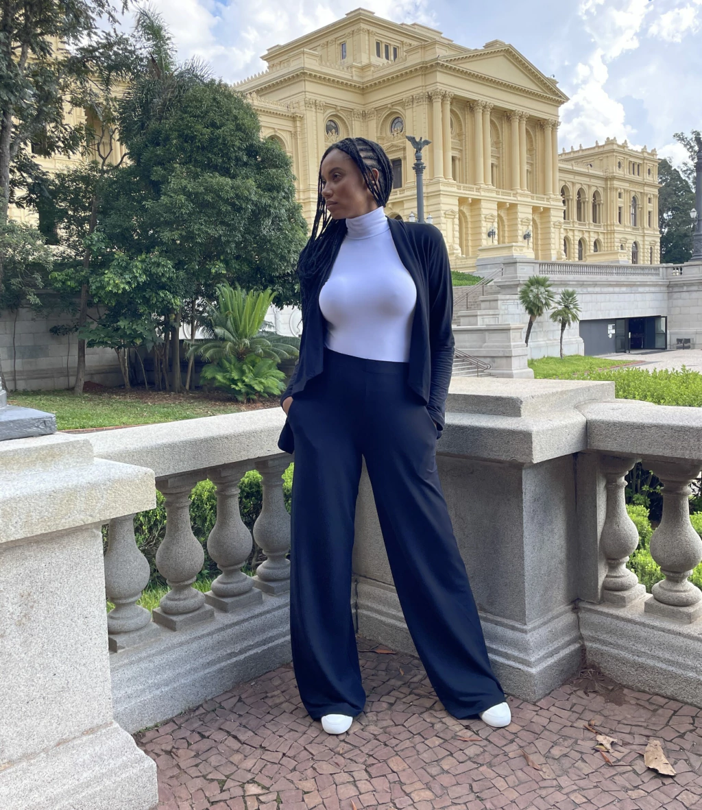 Calça pantalona com elástico na cintura e bolsos laterais.