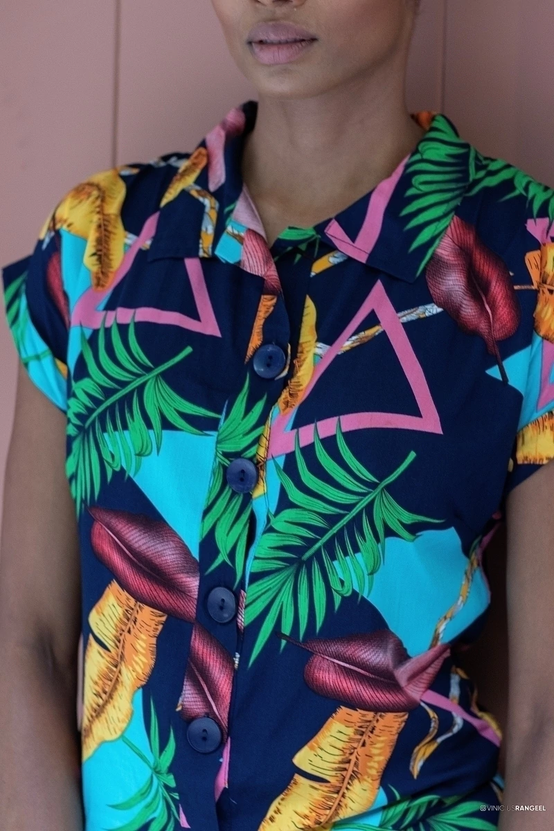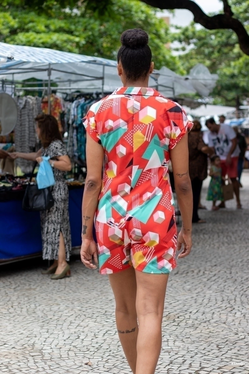 Macaquinho com abertura de botões frontais, gola estilo camisa, levemente acinturado, manga curta.