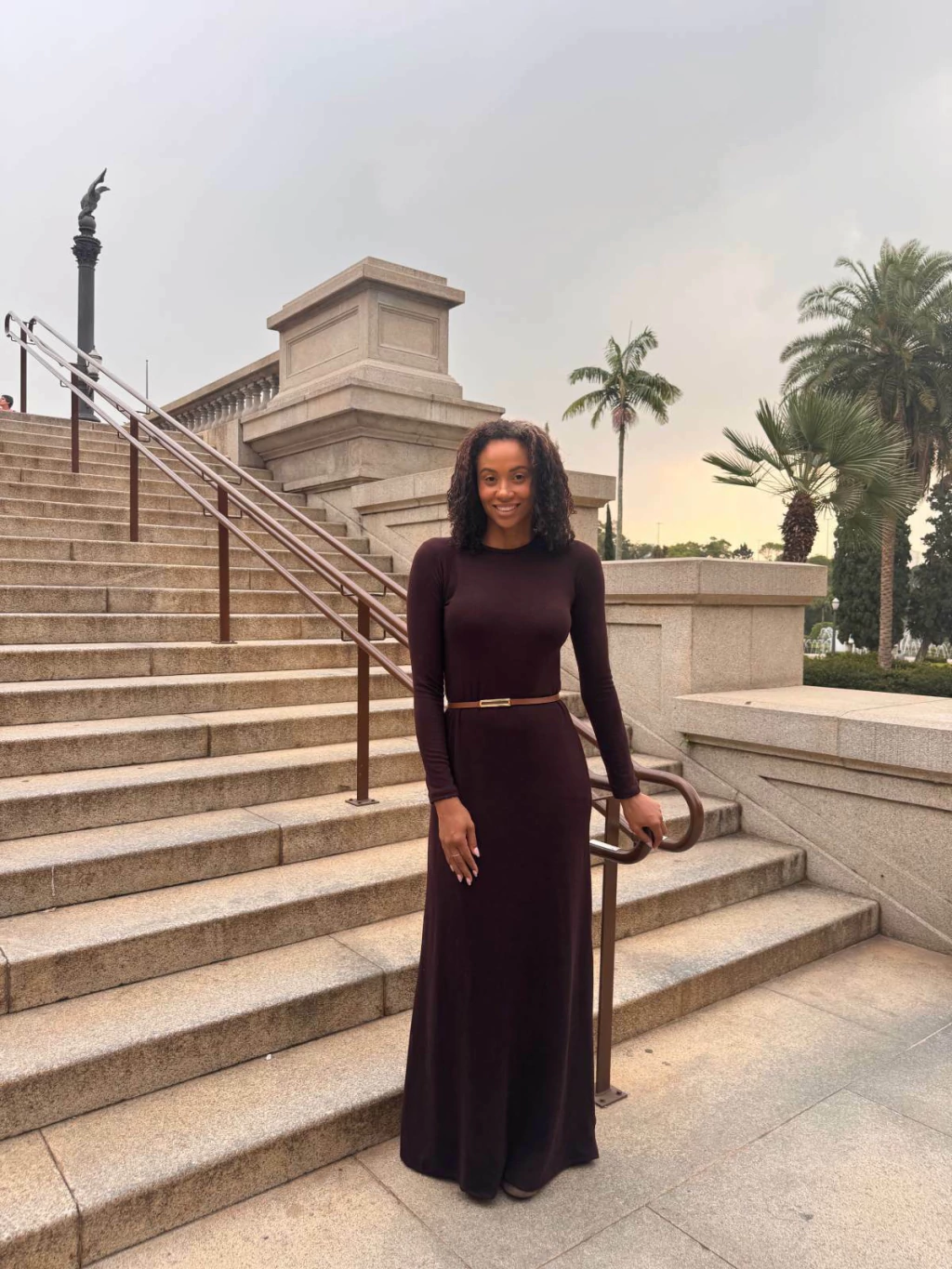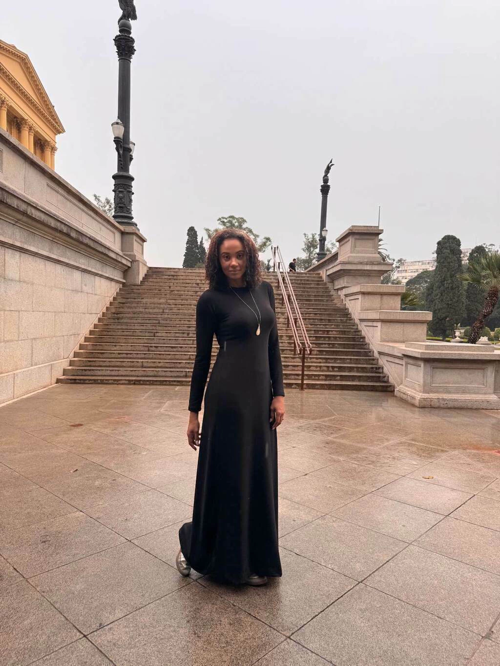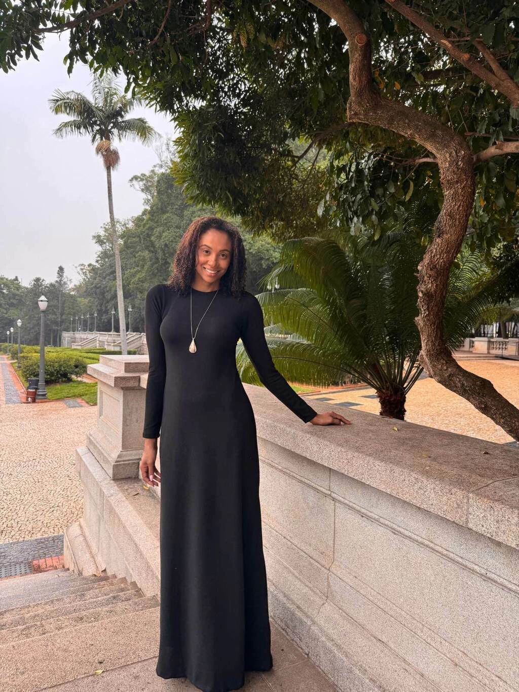 Vestido longo com modelagem clássica, comprimento ideal de saia e manga para mulheres altas.